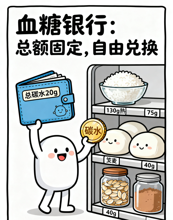 想象一下,你的身体就像一个银行,碳水化合物就是“血糖货币”。你每餐摄入的“货币”总量是固定的。你可以选择把这笔“钱”全部用来买“馒头”,也可以一部分买“米饭”,一部分买“燕麦”,甚至留出一点“额度”来买“水果”。只要总额度不超标,你的“血糖银行”就能保持稳定。