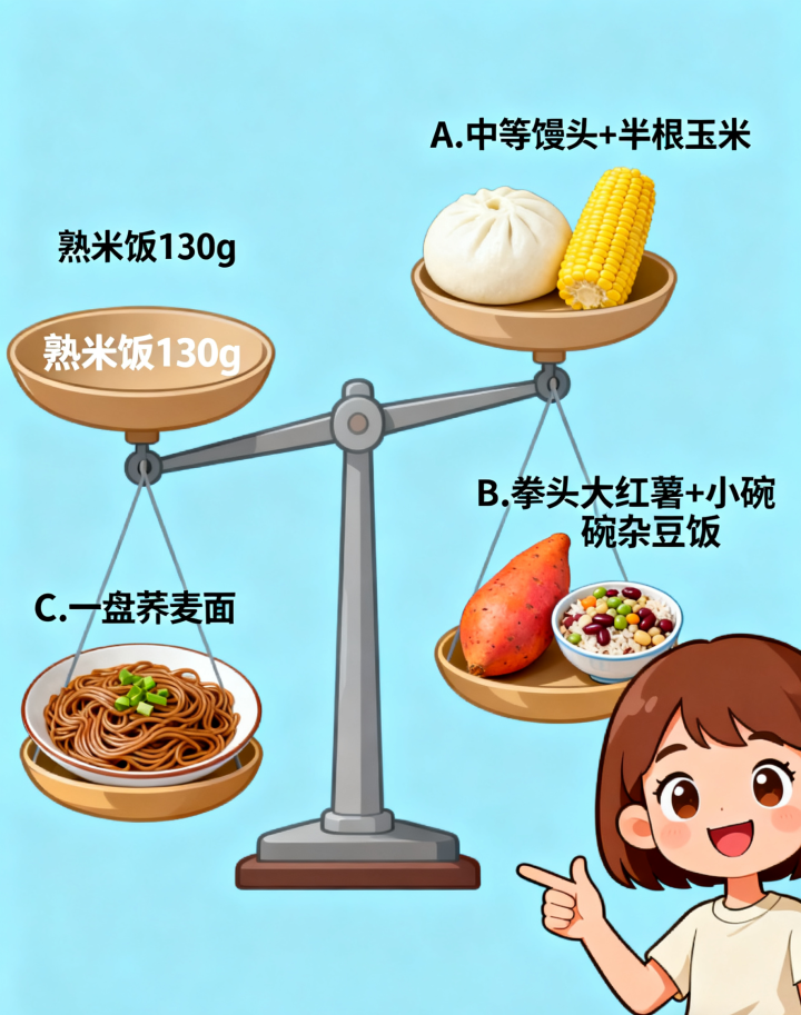 定时定量是根基: 交换的前提是每餐的总量稳定。不能因为今天换成了红薯,就吃得比米饭多一倍。